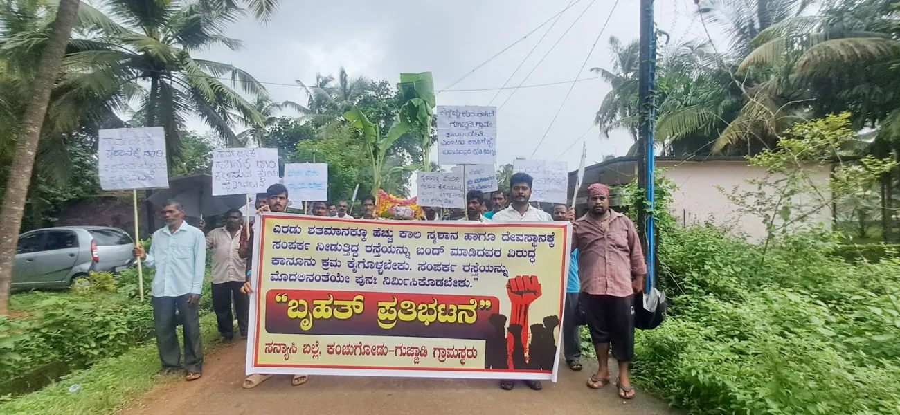 ಸ್ಮಶಾನಕ್ಕೆ ಸಂಪರ್ಕ ಕಲ್ಪಿಸುವ ಮಾರ್ಗವನ್ನು ಮುಚ್ಚಿದ ವ್ಯಕ್ತಿಗಳ ವಿರುದ್ಧ ಕ್ರಮ ಕೈಗೊಳ್ಳಬೇಕೆಂದು ಆಗ್ರಹಿಸಿ ಅಣಕು ಶವವನ್ನು ಕಂಚುಗೋಡಿನಿಂದ ಮೆರವಣಿಗೆಯಲ್ಲಿ ಹೊತ್ತು ತಂದು ಪಂಚಾಯತ್ ಎದುರು ಇರಿಸಿಕೊಂಡು ಪ್ರತಿಭಟನೆ ನಡೆಸಿದರು. ‘ಗುಜ್ಜಾಡಿ ಗ್ರಾಮ ಪಂಚಾಯತ್ ಕಣ್ಣಿದ್ದು ಕುರುಡಾಗಿದೆ’, ‘ಪ್ರತಿನಿಧಿಗಳು ಎಂಜಲು ಕಾಸಿಗೆ ಕೈ ಚಾಚಿದ್ದಾರೆ’, ‘ಮುಕ್ತಿಧಾಮಕ್ಕೆ ಬೇಕಿದೆ ಸಂಪರ್ಕ ರಸ್ತೆ’ ಎಂಬಿತ್ಯಾದಿ ನಾಮಫಲಕಗಳನ್ನು ಹಿಡಿದುಕೊಂಡು ಪಂಚಾಯತ್ ಎದುರು ಅಣಕು ಶವದ ಮೆರವಣಿಗೆ ಬಂದು ಪ್ರತಿಭಟನೆ ನಡೆಸಿದರೂ ಗ್ರಾಮ ಪಂಚಾಯತ್ ಅಧ್ಯಕ್ಷರಾಗಲಿ, ಉಪಾಧ್ಯಕ್ಷರಾಗಲಿ ಯಾವುದೇ ಸದಸ್ಯರಾಗಲಿ ೪ ಗಂಟೆಯವರೆಗೂ ಪಂಚಾಯತ್ಗೆ ಆಗಮಿಸದೆ ಉಳಿದರು. ರೆವಿನ್ಯೂ ಇನ್ಸಪೆಕ್ಟರ್ ಆಗಮಿಸಿ ಮನವೊಲಿಸಲು ಯತ್ನಿಸಿದಾಗ ಪ್ರತಿಭಟನಾಕಾರರು ಜಿಲ್ಲಾಧಿಕಾರಿಯವರು ಸ್ಥಳಕ್ಕೆ ಬರಬೇಕೆಂದು ಪಟ್ಟುಹಿಡಿದರು.